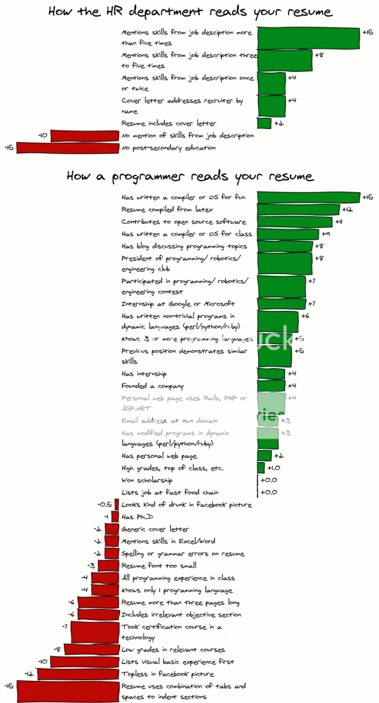 下面这个图片来源国外,是一个关于程序员面试时的简历,被人事部门和程序员本身评审的角度不同的图片。当然,这是一个从国外面试的视角制作的图片,不过,可以看出,其中很多东西都是和国内是相同的。让我们通过这个图片也来了解一下自身吧。