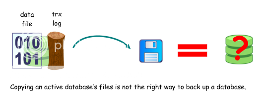 当数据库处于活动状态,你不能简单的copy它的文件,推荐方式是使用完整数据库备份(备份模式)。这是因为数据库的数据和日志文件不能处于非一致状态。这会导致仅仅在事务日志中被修改的数据页可能无法写入数据文件。这也会影响进程中的事务无法提交或是回滚已经写入文件中的数据。