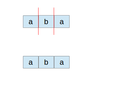 p[3] = ["aba"] ["a", "b", "a"],还是老样子从0开始看,从0到3的串为aba,它本身为回文,所以应该加入到里面。后面的1和2到3都不构成回文,所以跳过。