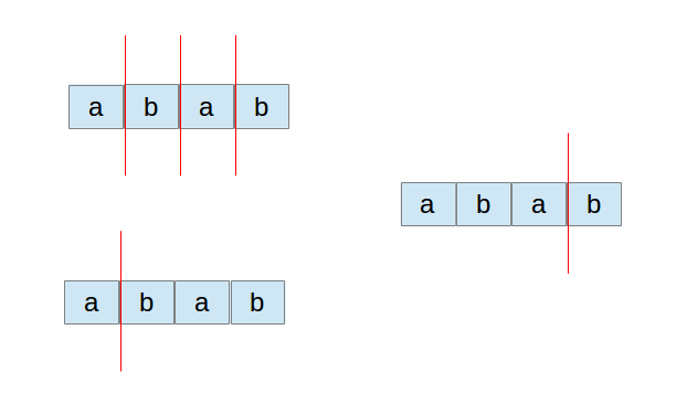 按照这个递归的关系,我们尝试递推一下划分的数量,比如有如下图的字符串: