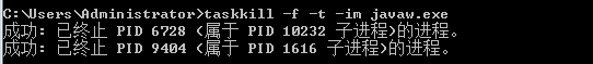 强制、递归 删除本程序及其子进程:taskkill -f -t -im javaw.exe