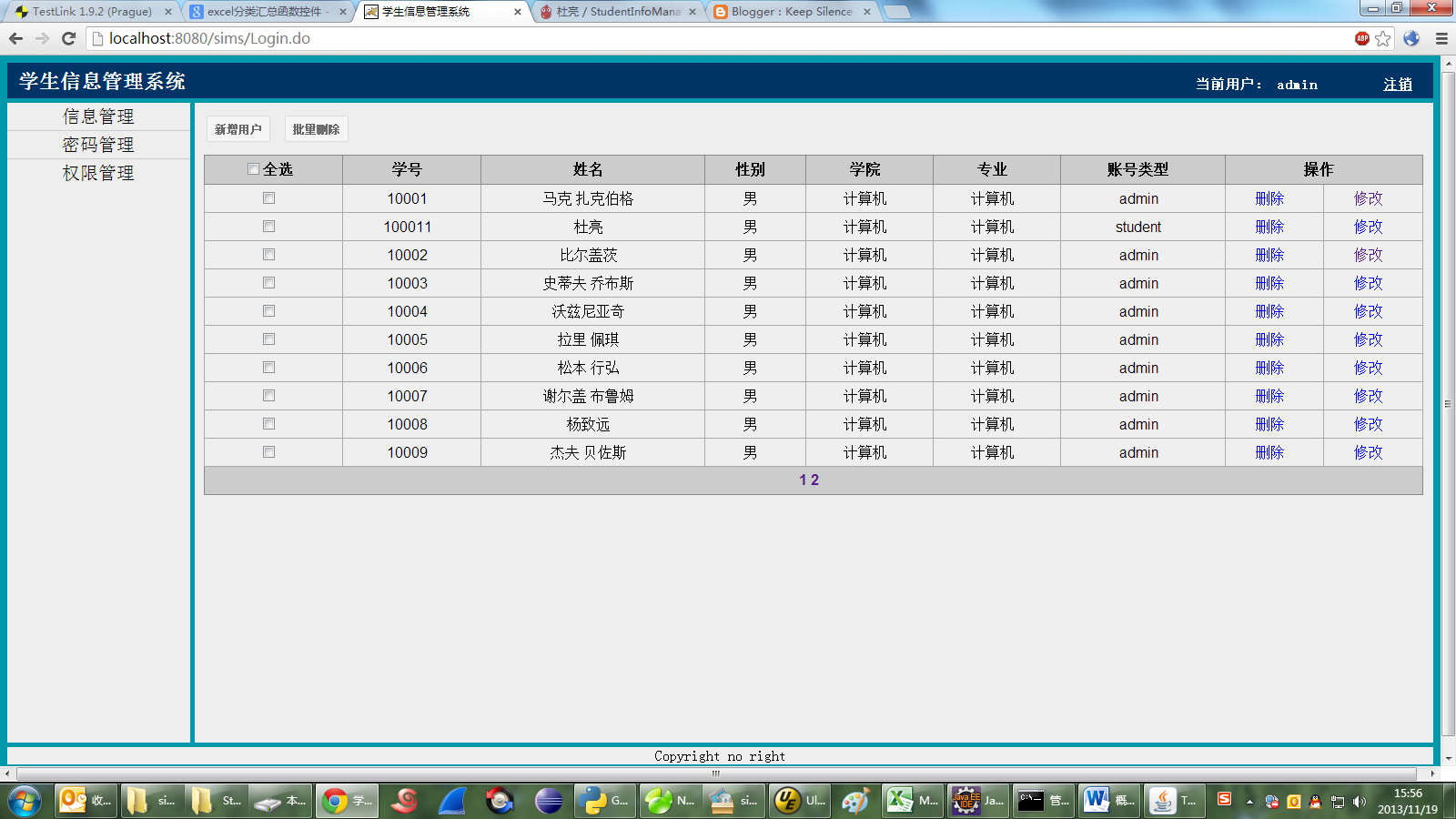 session的基本用法,用户登录以后在session中保存用户信息,在每个JSP页面body开始后校验session,从而避免非法访问,注销后需要销毁session,java中session默认过期时间是30MIN。我做的时候没有注意用户信息加密,spring security中有api专门完成用户登录、角色校验、权限分配,后面学习框架时再慢慢熟悉。