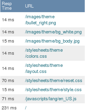 前面我讲了,这种机制会存在一个严重的性能问题,是怎么来的呢?在传统方式下,我们将css,images,js都放在public目录下,view进行引用的时候,在web服务器层面,就完成了文件的引用,发送操作。但是在typo这种机制下,每引用一个css,图片,js,web服务器会将请求route到rails,通过rails的ThemeController来处理请求,返回文件。这都还算小事,在一次request,response周期,这样一个额外操作往往占用不了多大的百分比。但是,我们知道ThemeController是rails中一个普通的Controller,它也继承自ApplicationController。通常,我们会将很多程序通用逻辑放在ApplicationController中来做,比如:验证用户合法性,处理本地化等等,而这些操作,大部分都是访问数据库。也就是说,我们通过ThemeController,仅仅想得到一个css或者图片文件,但是ApplicationController仍然会初始化,执行相应的操作(重复,无用的操作)。这就是性能问题的根源。口说无凭,下面的数据揭示了一切: