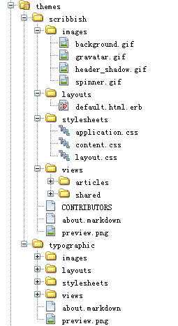 很经典的route配置,原来在typo中,所有对css,javascript,image的引用,不是通过直接引用public目录下的文件,而是通过一个传统的controller:ThemeController来完成的。至于ThemeContorller具体代码,这里不详细谈,因为不是本文的重点,无非就是根据当前选择的皮肤(在admin界面选择的),到相应的皮肤目录(比如:theme/typographic)下,将各个文件找到,然后通过send_file的方式发送到客户端浏览器。那执行完一次action后,controller到底应该执行怎么样的render操作呢?(通过上图,我们看到不同的view文件,在各自的theme子目录下)