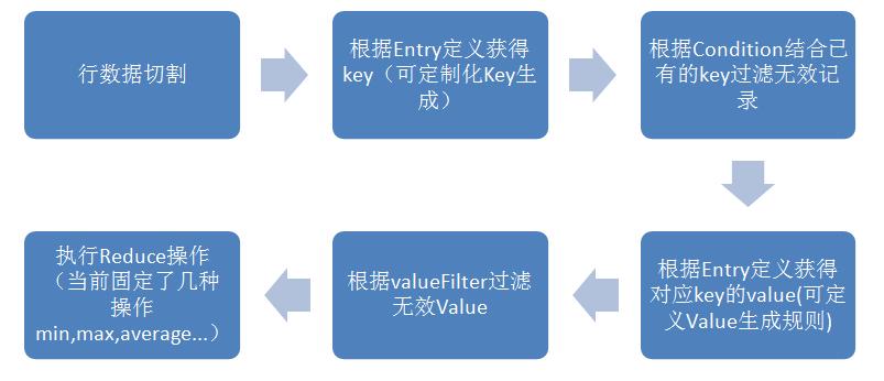 流程中可以扩展的在第三步和第四步,第三步影响了Key的生成(当简单的列组合成字符串无法满足生成key的情况下可扩展),第四步影响value的生成。(当map的value生成以及Reduce无法满足需求的情况下可扩展),要使用min,max…以外的reduce,可以直接在ReduceClass中作处理,然后使用plain输出实现。