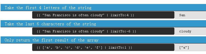 limitTo过滤器会根据传递的参数值来生成新的数组或字符串,参数值为整数,从开头截取,参数为负值,从最后开始截取