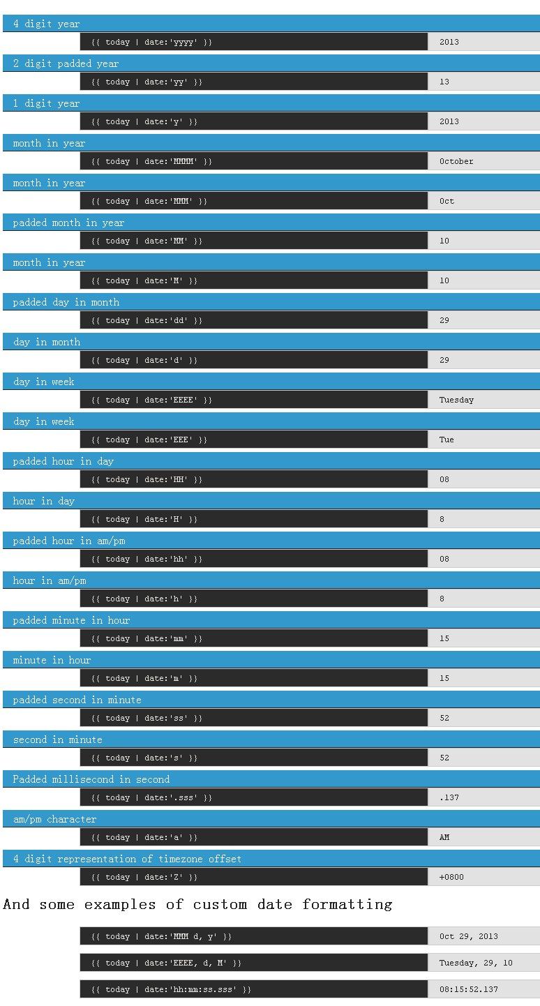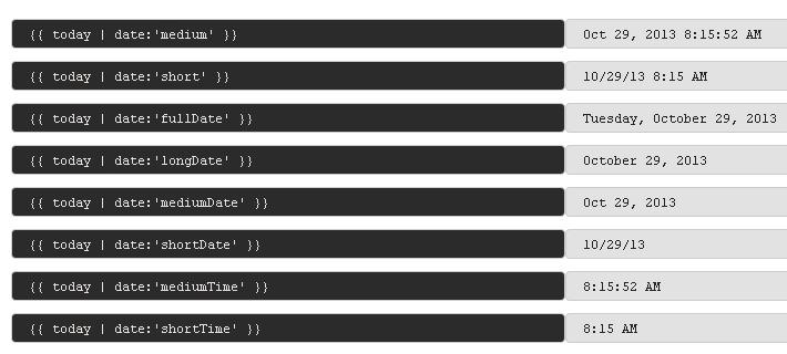 日期过滤器主要根据我们提供的格式化形式来格式化日期,他提供了很多内建的选项,如果没有指定格式,默认显示mediumDate形式