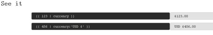 Currency过滤器主要是把数字格式化成货币,意思就是123格式化以后就成了$123.00
