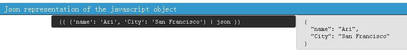 json 过滤器接收JSON或者JavaScript对象,然后转换成字符串,这个功能在调试程序的时候非常有用!译者感受:妈妈再也不用担心我的debug,方便的令人发指