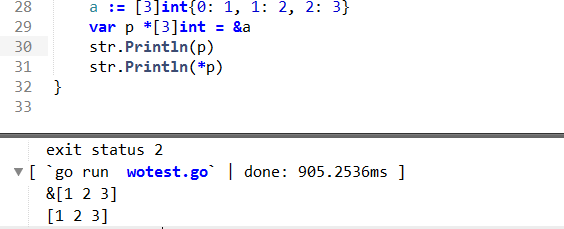 2 | var p * [3]int = &a //这种是指针数组 我们看到可以直接输出指向数组的指针 |