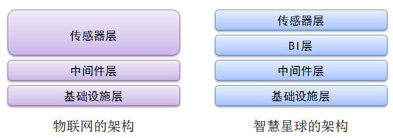 从这张图我们可以看出,物联网和智慧星球在技术层面的区别是:物联网非常强调通过各种传感器(比如,RFID,红外感应器和GPS等)来收集数据,而智慧星球则强调“智慧”,也就是通过BI层来对数据进行分析。