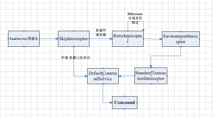 JBPM并没用完全照搬职责链的定义, 虽然在每个拦截器中都可以处理请求,但是JBPM设计的只能在DefaultCommandService里处理请求,然后再拦截器中处理环境资源初始化和长事务的管理等。