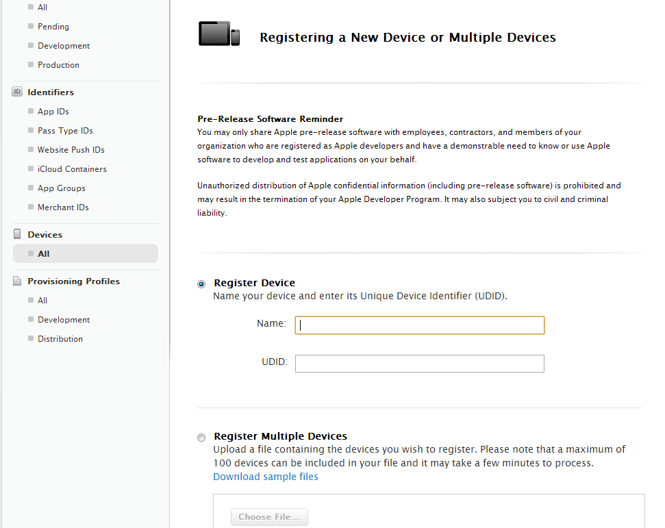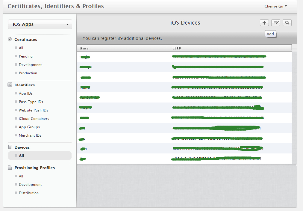 获取到UDID后,需要登陆在苹果开发者账号,打开Devices->All 把UDID添加进去