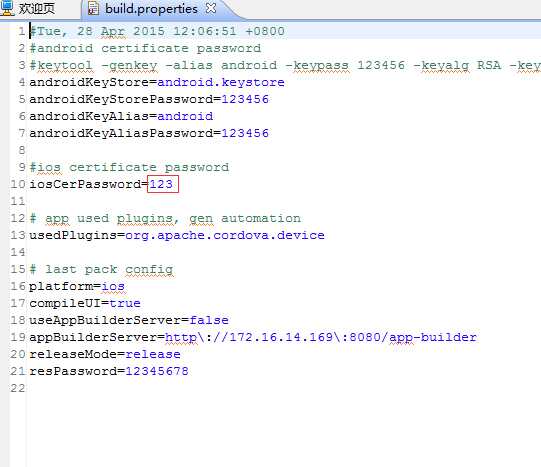 4)打开properties文件,修改为导出P12文件时设置的密码。详细博客《ios证书申请》第3.3小节的说明