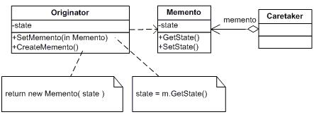 1.Memento(备忘录):保存Originator(原发器)对象的内部状态,Originator根据需要决定保存哪些内部状态,防止自身以外的其它对象访问备忘录。备忘录实际上是由两个接口,其中Caretaker(管理者)只能看到备忘录的窄接口,即它只能将备忘录传递给其他对象;而原发器可以看到一个宽接口,允许他访问回到原先状态所需的所有数据,理想的情况是只允许生成原发器访问本备忘录的内部状态。