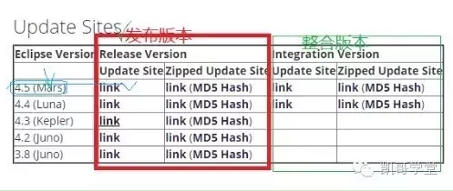 上图已经标明意思,我要看的是4.5(Mars)这行,因为我电脑上使用的eclipse是4.5,因此,我就选用这个对应版本,选择Release Version的Update Site中的link。(后面的是zip包。)
