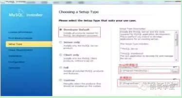 此处选择安装类型:Developer Default:开发者类型,就是默认就给程序员进行选择好的Server onle:仅仅安装服务器版本的类型Client onle:仅仅安装为客户端的类型Full:全部安装Custom:用户自定义安装(如果足够熟悉可以选择这个)