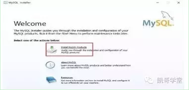此界面是mysql安装文件加载完成之后,出现的文件安装欢迎界面,这几个选项,点击“Install MySQL Products”就行了。(第一个是安装产品,第二和第三是说明和帮助)
