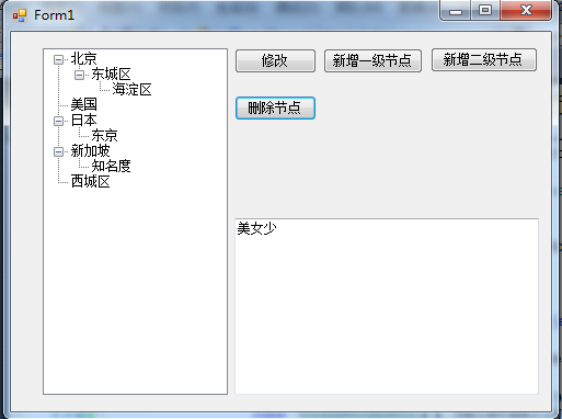 1 using System; 2 using System.Collections.Generic; 3 using System.Windows.Forms; 4 using DataTreeBLL; 5 using DataTreeModel; 6 7 namespace DataTree 8 { 9 public partial class Form1 : Form 10 { 11 public Form1() 12 { 13 InitializeComponent(); 14 } 15 16 private void Form1_Load(object sender, EventArgs e) 17 { 18 //获取所有的父节点对象 19 IEnumerable<ItemsNode> items= new TreeNodeBLL().GetEveryOneByParent(0); 20 21 foreach(ItemsNode item in items) 22 { 23 //创建一个节点实例 24 TreeNode Fnode = new TreeNode(); 25 Fnode.Text = item.name; 26 Fnode.Tag = item; 27 treeView1.Nodes.Add(Fnode); 28 GetChildNode(Fnode,(int)item.Id); 29 } 30 treeView1.ExpandAll(); 31 } 32 //遍历子节点 33 protected void GetChildNode(TreeNode Pnode,int id) 34 { 35 //获取所有以此节点最为的父节点对象 36 IEnumerable<ItemsNode> items = new TreeNodeBLL().GetEveryOneByParent(id); 37 foreach (ItemsNode item in items) 38 { 39 TreeNode Fnode = new TreeNode(); 40 Fnode.Text = item.name; 41 Fnode.Tag = item;//把节点的Tag指向对象 42 Pnode.Nodes.Add(Fnode); 43 GetChildNode(Fnode, (int)item.Id); 44 } 45 } 46 47 private void treeView1_AfterSelect(object sender, TreeViewEventArgs e) 48 { 49 ItemsNode item = (ItemsNode)e.Node.Tag; 50 tb_content.Text = item.content; 51 } 52 53 private void bt_modify_Click(object sender, EventArgs e) 54 { 55 ItemsNode item = (ItemsNode)treeView1.SelectedNode.Tag; 56 Frmodify form = new Frmodify(); 57 form.FName = item.name; 58 form.Content = item.content; 59 if (form.ShowDialog()== DialogResult.OK)//递交修改指令 60 { 61 item.name = form.FName; 62 item.content = form.Content; 63 new TreeNodeBLL().UpdateRecord(item); 64 treeView1.SelectedNode.Text = item.name; 65 tb_content.Text = item.content; 66 } 67 } 68 69 private void bt_Insert_1_Click(object sender, EventArgs e) 70 { 71 Frmodify form = new Frmodify(); 72 if (form.ShowDialog() == DialogResult.OK) 73 { 74 ItemsNode item = new ItemsNode(); 75 item.name=form.FName; 76 item.content=form.Content; 77 item.parentId = 0;//一级节点 78 new TreeNodeBLL().InsertRecord(item); 79 TreeNode Node = new TreeNode(); 80 Node.Text=item.name; 81 Node.Tag=item; 82 treeView1.Nodes.Add(Node); 83 } 84 } 85 86 private void bt_Insert2_Click(object sender, EventArgs e) 87 { 88 TreeNode CurrentNode = treeView1.SelectedNode; 89 Frmodify form = new Frmodify(); 90 if (form.ShowDialog() == DialogResult.OK) 91 { 92 ItemsNode item = (ItemsNode)CurrentNode.Tag; 93 item.name = form.FName; 94 item.content = form.Content; 95 item.parentId=item.Id; 96 new TreeNodeBLL().InsertRecord(item); 97 //显示到界面 98 TreeNode Node = new TreeNode(); 99 Node.Text = item.name; 100 Node.Tag = item; 101 CurrentNode.Nodes.Add(Node); 102 } 103 } 104 105 private void bt_Delete_Click(object sender, EventArgs e) 106 { 107 TreeNode Node = treeView1.SelectedNode; 108 Node.Remove(); 109 ItemsNode item = (ItemsNode)Node.Tag; 110 new TreeNodeBLL().DeleteAllNode((int)item.Id); 111 } 112 } 113 }