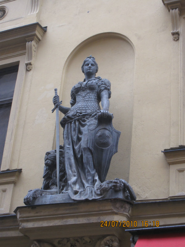 [060077] 外墙上的女武士雕塑。