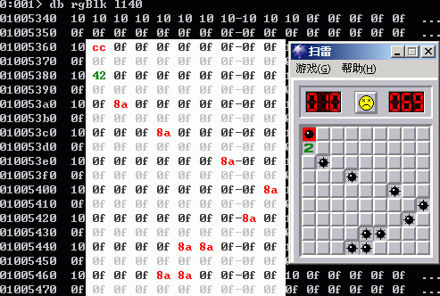 在上图中我对db输出的结果做了处理,其中白色背景的被选定文本区域是游戏区的有效内存数据,灰色的文字也代表了无效(横坐标大于9)的数据。红色的8f代表随机生成的地雷,1f代表这个方块还未被翻开。