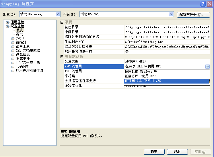 库”或“在静态库中使用MFC”,test2选择的是“在共享DLL中使用MFC”