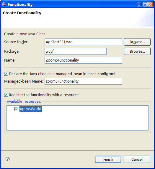 让我们打开eclipse的菜单【ArcGIS】-【Class Templates】-【Functionality】,在新建的窗口上填上我们希望实现的Functionality的包名、类名、实例化 Managed Bean的名称、注册到的Resource等,完成以后ADF会自动新建一个实现GISFunctionality接口的类,并把这个类实例化后注册到 ADF应用的配置文件中去。