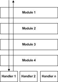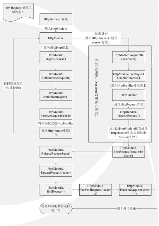 ASP.NET请求处理过程是基于管道模型的,这个管道模型是由多个HttpModule和HttpHandler组成,ASP.NET 把http请求依次传递给管道中各个HttpModule,最终被HttpHandler处理,处理完成后,再次经过管道中的HTTP模块,把结果返回给 客户端。我们可以在每个HttpModule中都可以干预请求的处理过程。
