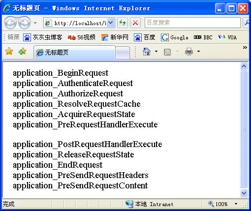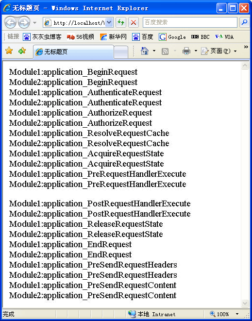 如果定义了多个HttpModule,在web.config文件中引入自定义HttpModule的顺序就决定了多个自定义HttpModule在处理一个HTTP请求的接管顺序。
