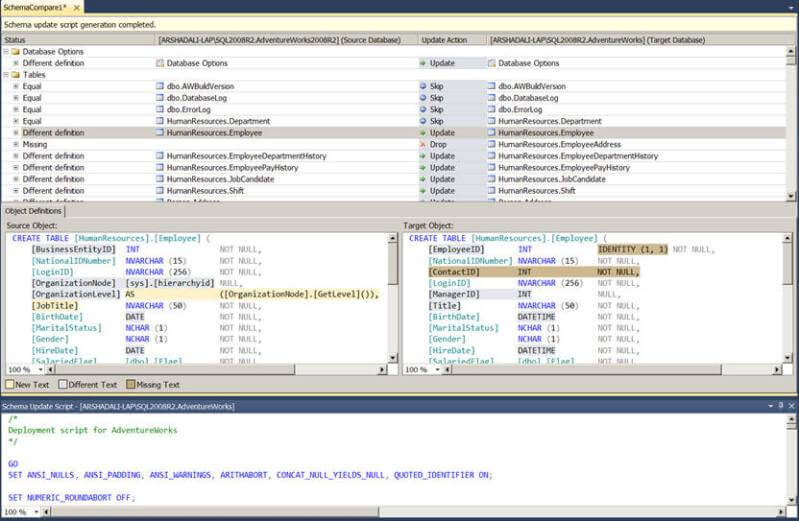 Note: As long as your source has new objects there is nothing to worried about, but if you have renamed your objects or columns at the source you might incur data loss while updating the target. For example in the above schema comparison result image you can see the EmployeeID column has been renamed to BusinessEntityID, so while updating the target it will drop the EmployeeID column and add the BusinessEntityID column which will have no data even though the EmployeeID column has data in it. So it is recommended to review your deployment scripts and take a backup of your target database before updating the target database. You can change this default behavior of data loss in the Schema Compare Options, as discussed above, and check the "Block schema updates if data loss might occur" under Script generation options and then the generated script will look like this if it would cause any data loss.