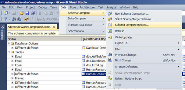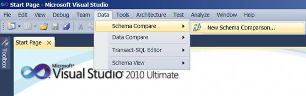 Problem Solution In this demonstration I am going to show you how Schema Comparison works on Visual Studio 2010 Ultimate edition although you can do the same with Visual Studio 2005/2008 Database edition too. Open the Microsoft Visual Studio IDE (Integrated Development Studio) and you will see a "Data" menu in the menu bar depending on the Microsoft Visual Studio edition you have installed (for more details click here). Select Schema Compare under Data menu and then New Schema Comparison as shown below.