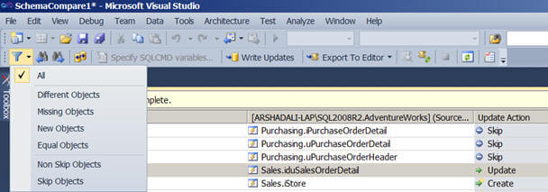 The moment you click on the OK button, it will start doing the comparison. You will notice a new tool bar, some of the options of this new tool bar are: you can filter out the comparison result as you can see in the image below, you can synchronize your target by writing updates to it (have a look on the note below before doing this), you can export your synchronization/incremental update script to a file or to the editor.