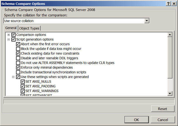 The Schema Comparison tool allows you to specify the different schema comparison options as well as specify which types of objects are to be compared as shown; make note here by default the Schema Comparison tool ignores extended properties, you can change this default behavior as well in the comparison options: