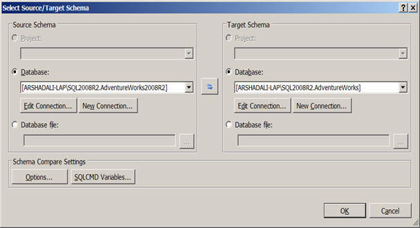 You will see a dialog box like this, here you need to specify your source schema and target schema. The source or target could be either a database project (offline representation of your database) or the database itself (for which you need to set up a connection to your SQL Server instance) or a *.dbschema file. You can even save your selection as *.scmp file to use later on.
