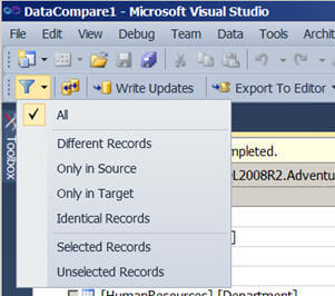 The moment you click on the Finish button in the above screen, it will start doing the data comparison for the selected objects and finally will show the comparison result. You will notice a new tool bar on top, some of the options of this new tool bar are: you can filter out the data comparison result as you can see in the image below, you can synchronize your target tables' data by writing updates to it, you can export your data synchronization/incremental update script to a file or to the editor.