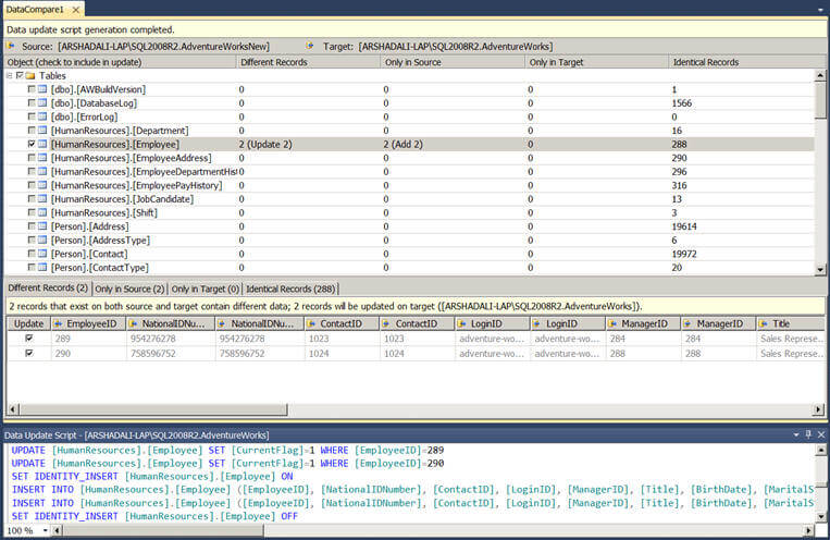 The data comparison result screen will look like the image shown below. On the top pane there are five columns; the first column shows the name of the objects considered in the comparison, second column tells the number of different records between source and target, third column tells the number of records which only exist in source likewise the fourth column gives the number of records which only exist in target and finally the fifth column gives the total number of identical records between source and target. The next pane has four different tabs, if you notice in the "Different Records" tab the first column "Update" is a check box which you can select/unselect to consider that record in synchronization, next you will see the primary/unique key and then later on all the columns appear twice, the first appearance shows the column value from the source and the second appearance shows the column value from the target. This way you can easily see/compare the changes. The bottom pane shows the target database data update script depending on the basis of the selection you used above. As you can see, I have two updates and two new records at the source and the scripts appear in this pane. If you are not able to see it or want to refresh it, click on the "Refresh Update Script" icon on the toolbar to display or to refresh the changes.