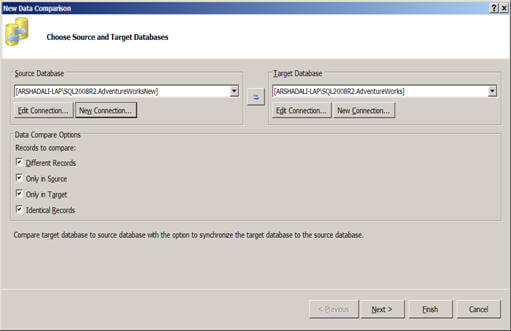 You will see a dialog box like this, here you need to specify your source and target database (for which you need to set up a connection to your SQL Server instance). And next you can specify the data comparison options, for example do you want to list all the different records on the result screen or/and records which only exist in source or/and records which only exist in target or/and identical records between source and target. Click on Next to move ahead in the wizard.