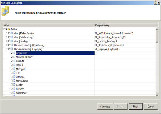 On the next screen you can select which tables or views you want to be considered during the data comparison, also you can individually select the columns which you want to be part of the comparison as you can see below. The source and target tables/views must have a primary/unique key which is used as a comparison key during the data comparison. If the table/view has multiple indexes you can select which one will be considered as the comparison key here also.