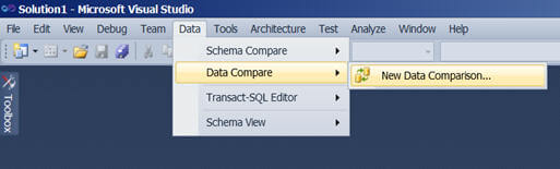 Problem Solution Microsoft Visual Studio Database edition offers several features for database development, for example you can create a database project which is nothing but an offline representation of a database for database development and version control, Database Unit Testing, Code Analysis, Schema Comparison, Data Comparison etc. In this demonstration I am going to show how Data Comparison works on Visual Studio 2010 Ultimate edition although you can do the same with Visual Studio 2005/2008 Database edition too. Open the Microsoft Visual Studio IDE (Integrated Development Studio) and you will see a "Data" menu in the menu bar depending on the Microsoft Visual Studio edition you have installed (for more details click here). Select Data Compare under Data menu and then New Data Comparison as shown below.