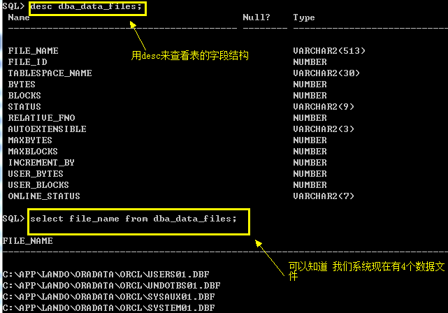 我们可以通过dba_data_files数据字典(数据字典就是存储一些系统数据)数据文件的状态。有一些字段解释一下: