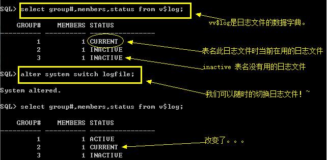 当一个日志文件组的空间被占用完了之后,Oracle系统会自动转换到另一个日志文件组。不过,也可以使用alter system swithch logfile 进行手动切换。
