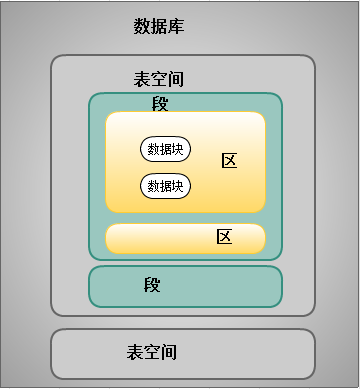 Oracle数据库的表空间从逻辑存储结构上来说,包括表空间、段、区和数据快。他们之间的关系是多个数据库组成一个区,多个区组成一个段,多个段组成一个表空间,多个表空间组成数据库,所以图如下: