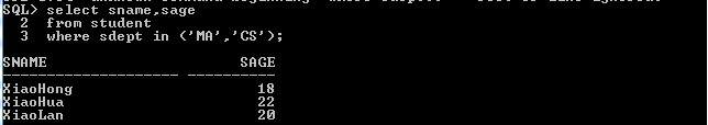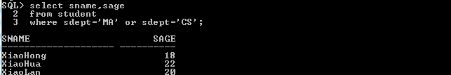 【例子15】在例子9中,我们使用了in,其实,我们也可以用or来代替找出在学生的系在CS和MA的学生。