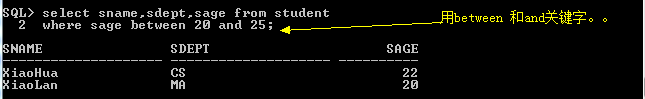 【例子8】查询年龄在20~25(包括20 和25)岁之间的学生名字、系别和年龄。