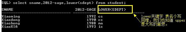 【例子4】我现在要找出全体学生的姓名、出生年份以及院系,但要求院系都要小写!如下: