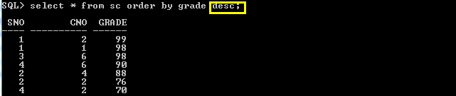 用户可以使用order by语句来进行对查询结构的列进行升序(ASC)或者降序(DESC)