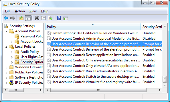 这种方法十分强势,但它只是关闭了整个UAC。有一种更精细的配置方式可以让你在不接到提示的情况下享受UAC的好处。你需要修改本地安全策略(Local Security Policy)来控制它,如下: