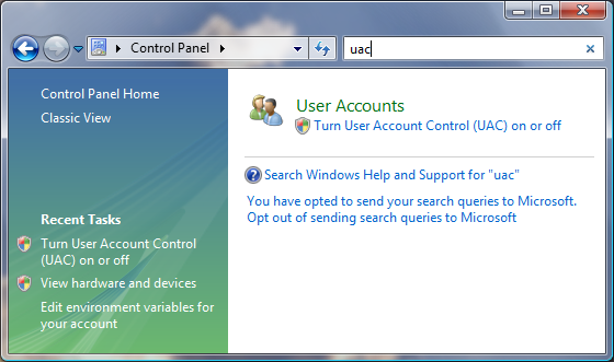 关闭UAC是可能的,但是我真的不建议这么做,如果你喜欢完全控制你的机器,你肯定需要知道什么时候会尝试执行一个管理员级别的动作。不管怎么说,我宁可你运行运行没有UAC的Windows Vista,也不愿意你运行其它的操作系统。