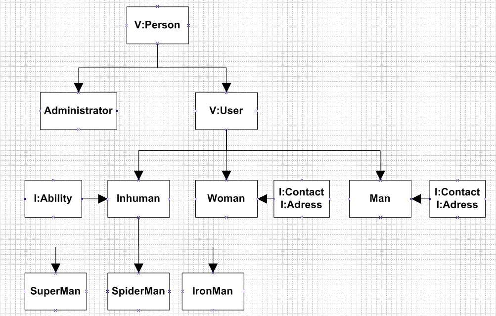 从图中可以看出,由抽象类Person派生出Administration与抽象类User。类Man与类Womam实现了接口Address与接口Contact,Inhumans则实现了Ability接口。
